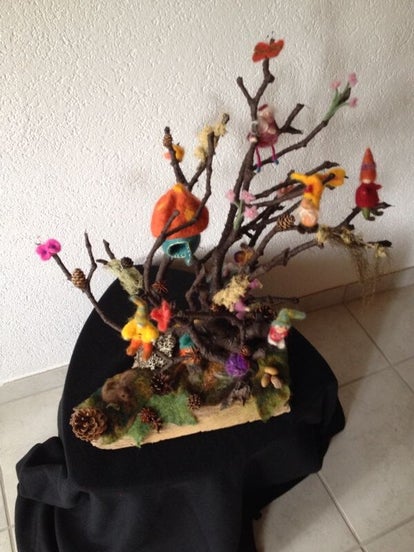 Als Stamm für den Märlibaum wurde Einheimisches Gehölz verwendet. Viele gefilzte Märlifiguren in lustigen Posen erwecken den Baum förmlich zum Leben.