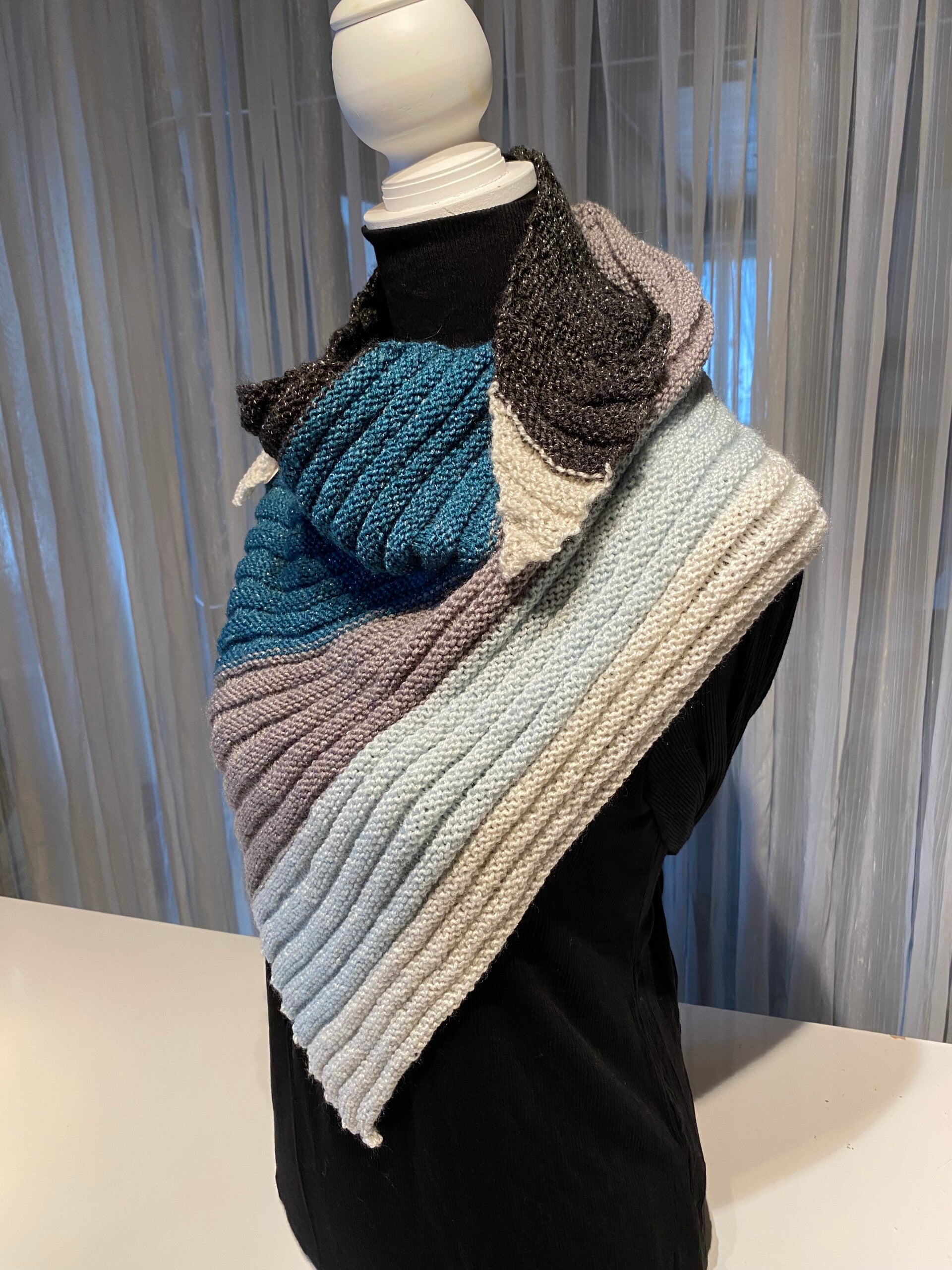 Gestricktes Dreiecktuch asymmetrisch hellblau, grau & petrol